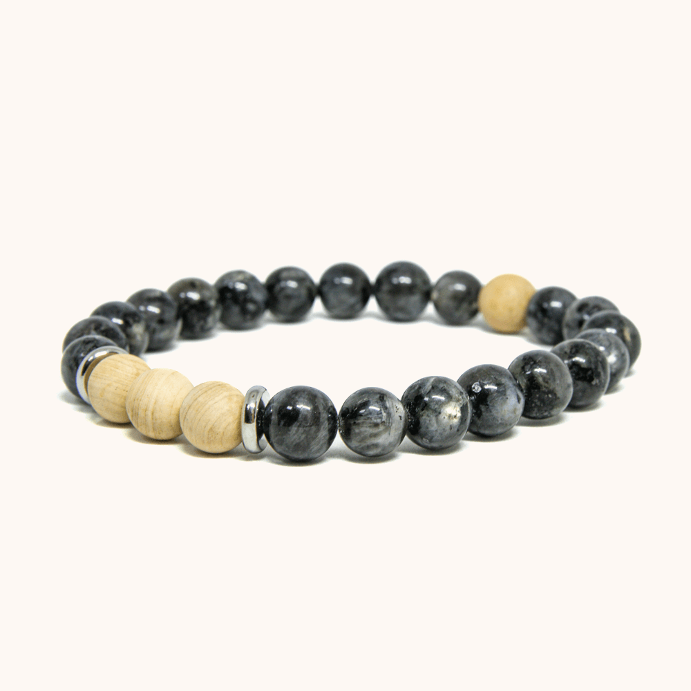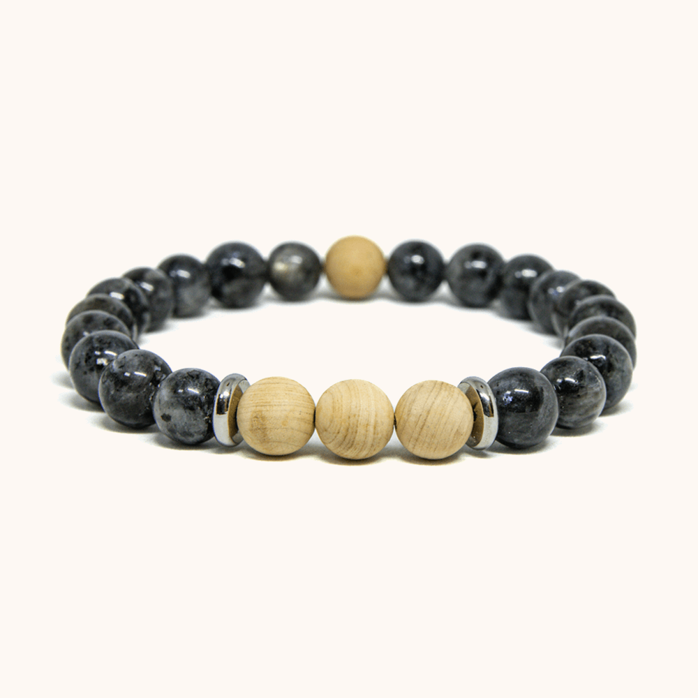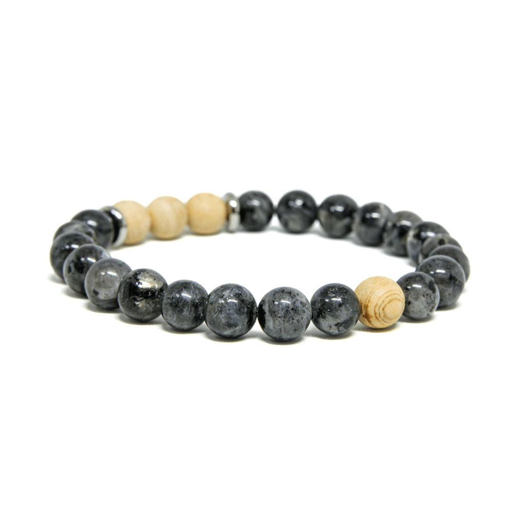 אבן לרוויקיט אפורה עם ברק כסוף עדין משתלבת עם חרוזי עץ מייפל בהירים ומפרידי כסף. הניגודיות בין האפור המסתורי לגוון העץ החם יוצרת צמיד מאוזן ומעודן שמתאים לכל סגנון – מקרינה אלגנטיות שקטה עם נגיעה טבעית.